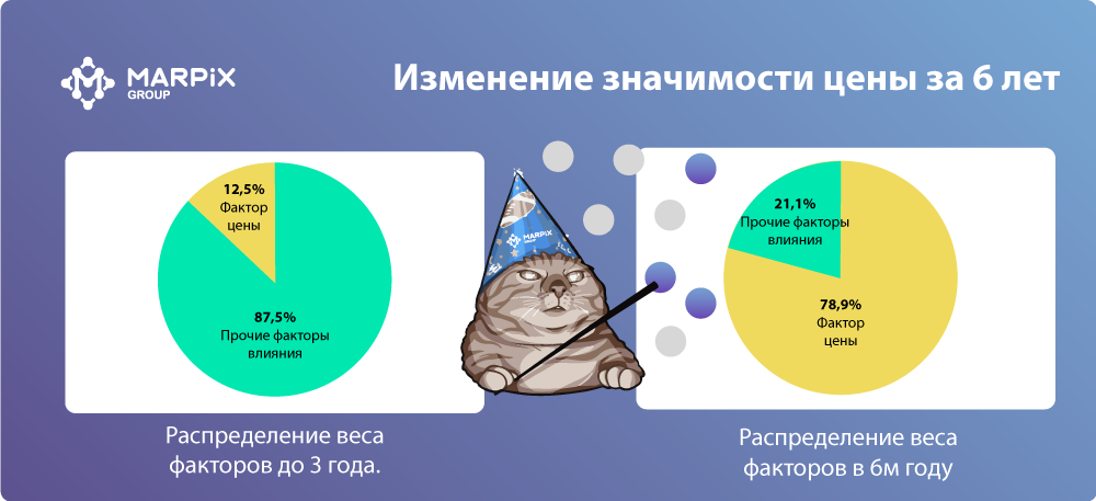 Как менялось влияние цены на спрос. Стало очень интересно, когда разделил анализ на два периода – до снижения продаж и после. С 1-го до 3-го года. И с 4-го по 6-й год. Итоги оказались показательными! До 3-года включительно года цена влияла на продажи лишь на 12,5%. 87,5% объяснялось прочими факторами влияния. Это говорит о том, что покупатели соглашались приобретать, в меньшей степени ориентируясь на стоимость. Это вполне понятно, ведь товар на тот момент не имел прямых конкурентов и имел статус «инновационного». А товары-заменители еще не получили широкого распространения. В 6 году цена влияла на продажи уже на 78,9%. Лишь 21,1% объяснил прочие факторы (реклама, техническое сопровождение, обучение и другие мероприятия). Вывод - цена стала определяющим фактором, влияющим на продажи.